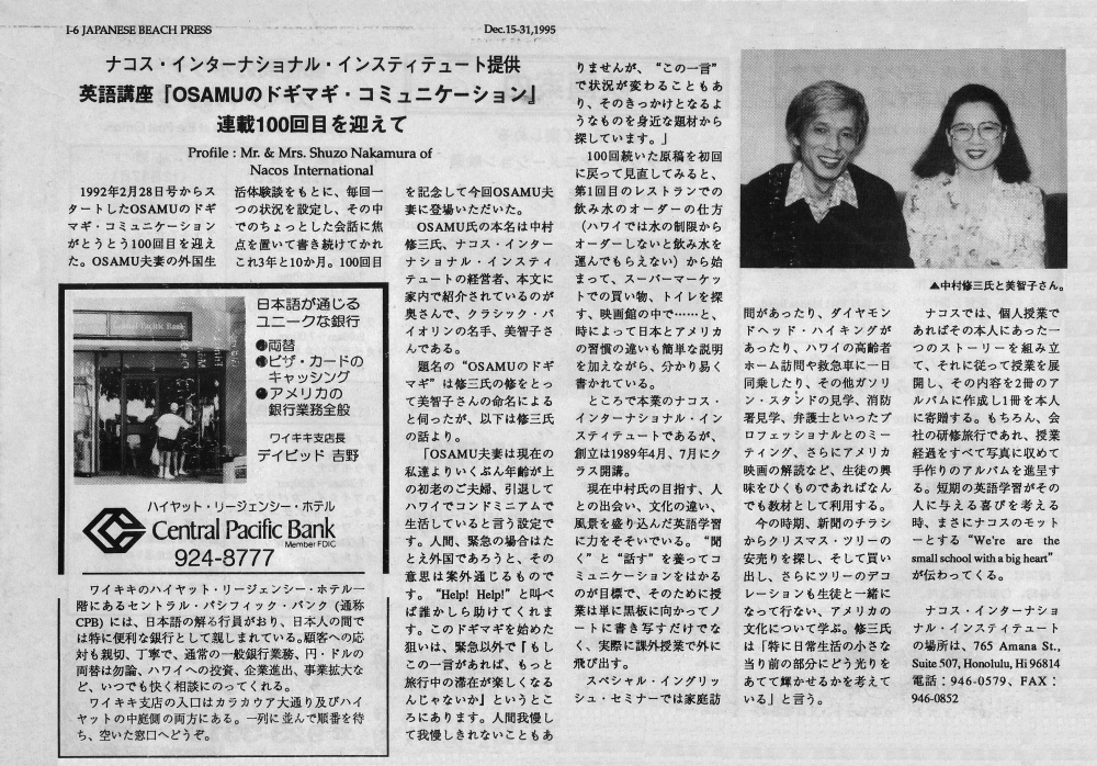 「ドクター夏子の医療談話室」、「ナコス英会話の掲示板」(ハワイ・パシフィック・プレス紙上に連載)を、ナコスウェブサイト(英語版)「NACOS Articles」に、新たに登場させています。